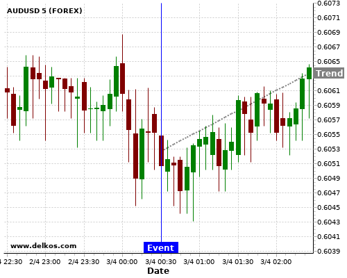 If the number is greater than than economists’ consensus there is a 80% probability that AUDUSD will trend up following the news event.