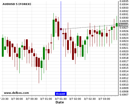 If the number is greater than than economists’ consensus there is a 83.33% probability that AUDUSD will trend up following the news event.