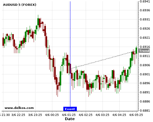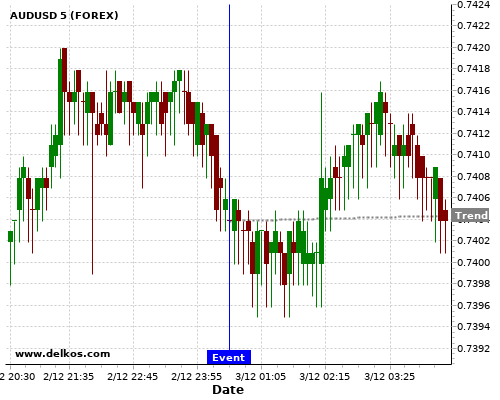 This probability is based on the last 12 AU Balance of Trade events, in which 5 of the last 6 events where the actual number was greater than than the economist consensus resulted in an up trend of AUDUSD.
