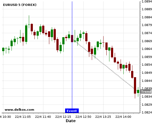 If the number is less than than economists’ consensus there is a 83.33% probability that EURUSD will trend down following the news event.