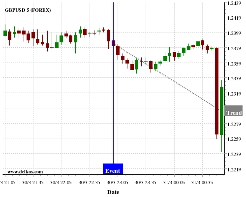 This probability is based on the last 12 GB Gfk Consumer Confidence events, in which 5 of the last 6 events where the actual number was greater than than the economist consensus resulted in an down trend of GBPUSD.