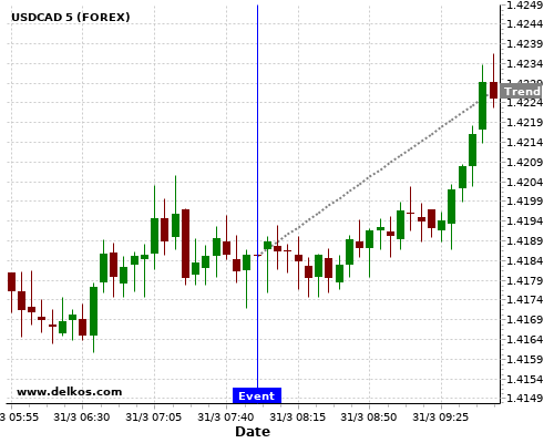 This probability is based on the last 12 DE Unemployment Rate events, in which 5 of the last 6 events where the actual number was less than than the economist consensus resulted in an up trend of USDCAD.