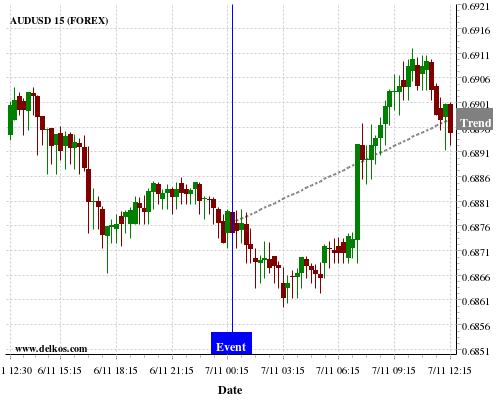 If the number is greater than than economists’ consensus there is a 85.71% probability that AUDUSD will trend up following the news event.