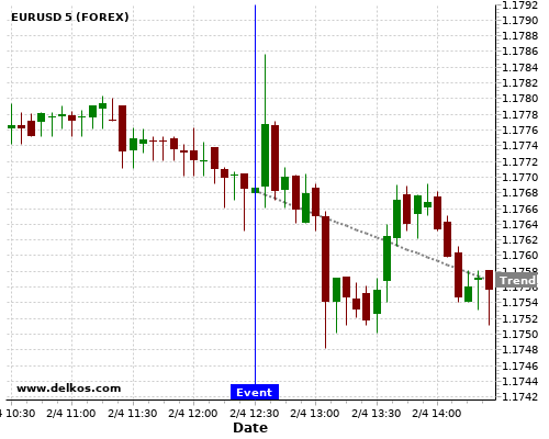 This probability is based on the last 12 US Non Farm Payrolls events, in which 6 of the last 7 events where the actual number was greater than than the economist consensus resulted in an down trend of EURUSD.