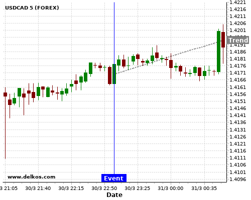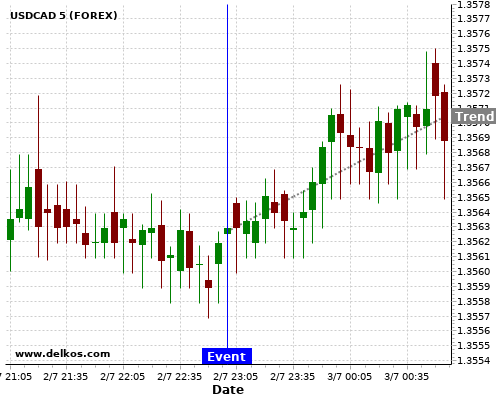 If the number is greater than than economists’ consensus there is a 85.71% probability that USDCAD will trend up following the news event.