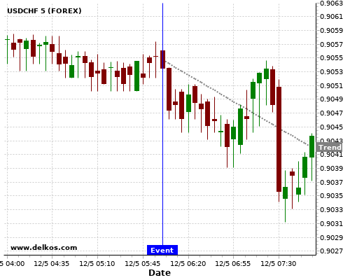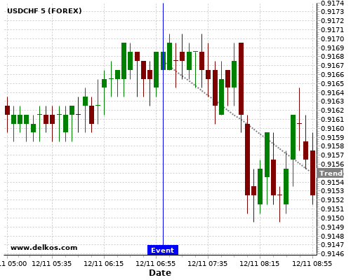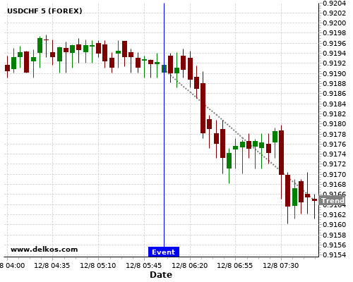 This probability is based on the last 12 GB Balance of Trade events, in which 6 of the last 7 events where the actual number was greater than than the economist consensus resulted in an down trend of USDCHF.