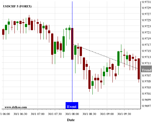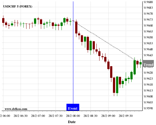 If the number is greater than than economists’ consensus there is a 85.71% probability that USDCHF will trend down following the news event.