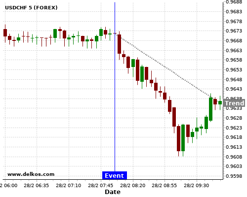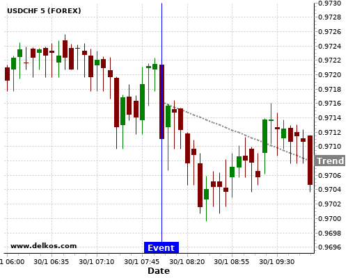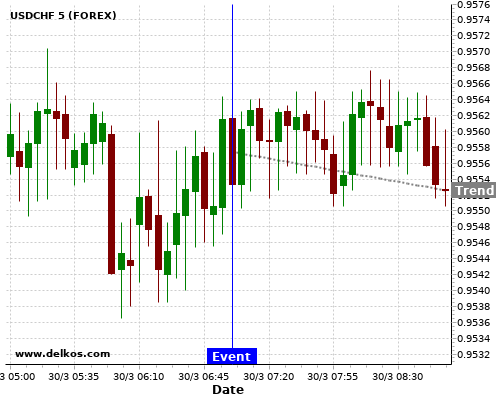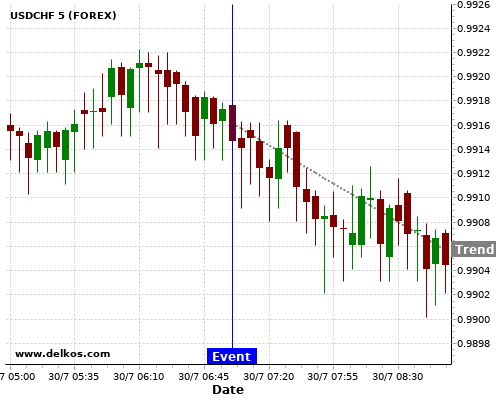 If the number is greater than than economists’ consensus there is a 85.71% probability that USDCHF will trend down following the news event.