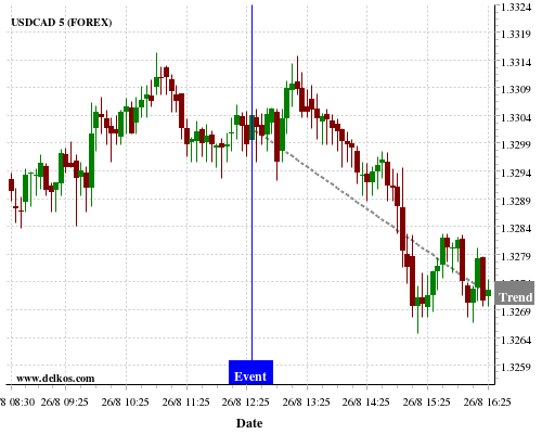 This probability is based on the last 12 US Durable Goods Orders MoM events, in which 5 of the last 8 events where the actual number was greater than than the economist consensus resulted in an down trend of USDCAD.