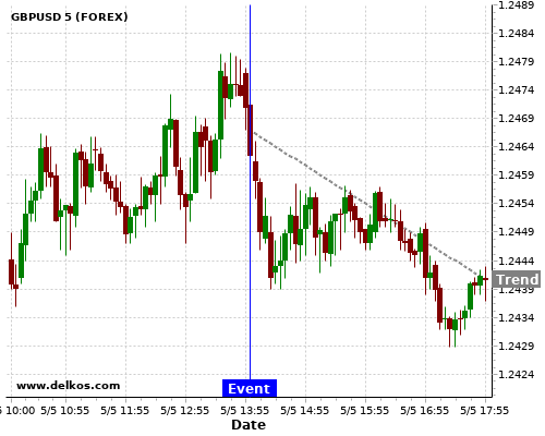 This probability is based on the last 12 US ISM Non-Manufacturing PMI events, in which 4 of the last 9 events where the actual number was greater than than the economist consensus resulted in an down trend of GBPUSD.