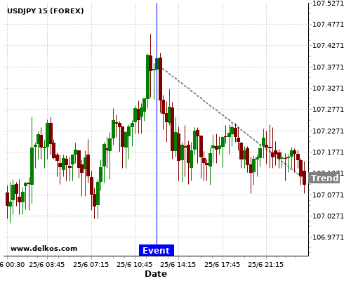 This probability is based on the last 12 US Durable Goods Orders MoM events, in which 7 of the last 9 events where the actual number was greater than than the economist consensus resulted in an down trend of USDJPY.